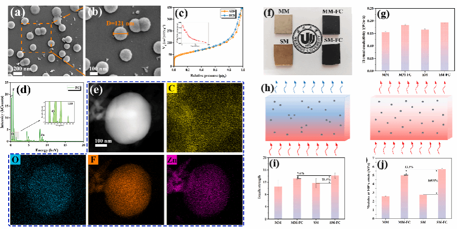图1 (a)和(b)分别为不同放大倍数下的含氟纳米碳球的形貌,(c) N2吸脱附曲线, (d)和(e)为含氟纳米碳球的EDS分析结果,(f)机械共混或溶液混合法制备的不同氟橡胶,(g)和(h)氟橡胶的导热性能和导热机理,(i)和(j)为不同氟橡胶的拉伸强度和100%定伸应力