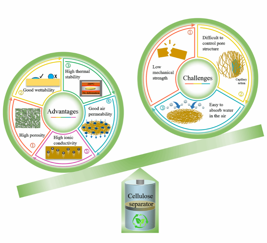电池隔膜作为电池的四大主材之一,其对电池的安全至关重要。如今商业化使用的可充电电池隔膜大多为聚丙烯和聚乙烯隔膜,其具有机械强度高、化学稳定性好的特点。但是,由于其熔点较低,当电池在充放电过程或遭受冲击内部温度升高时,这些隔膜可能会熔化收缩。隔膜熔化收缩将导致电池正负极直接接触造成电池起火爆炸产生严重的安全问题。纤维素作为世界上最丰富的生物聚合物,因其低成本、无污染和可再生性早已成为科学家研究的重点。由于纤维素良好的耐热性、润湿性、高化学稳定性和优秀的成膜性,使得其在隔膜领域的研究不断增加。纤维素材料作为可充电电池隔膜可以提供更加安全、良好的电化学性能。