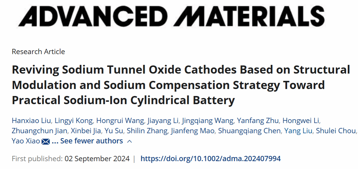 该成果以“Reviving Sodium Tunnel Oxide Cathodes Based on Structural Modulation and Sodium Compensation Strategy Towards Practical Sodium-ion Cylindrical Battery”为题,发表在《Advanced Materials》上,云顶7610线路检测为第一通讯单位,公司硕士研究生刘含笑和孔令益为共同第一作者。