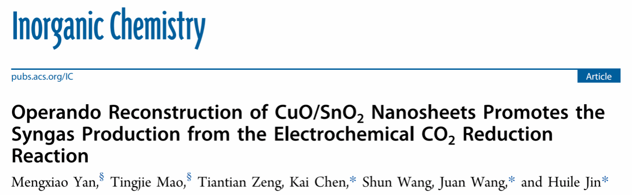 该研究结果以“Operando Reconstruction of CuO/SnO2 Nanosheets Promotes the Syngas Production from the Electrochemical CO2 Reduction Reaction”为题发表在国际权威期刊《Inorganic Chemistry》,云顶7610线路检测作为第一通讯单位,公司2023级研究生颜梦晓和2024级博士生毛挺杰为文章的共同第一作者,公司陈凯副教授,王娟副教授和金辉乐研究员为共同通讯作者。