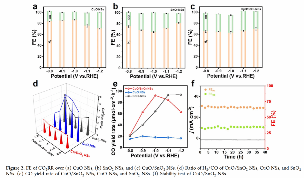 本文对CO2RR过程中CuO/SnO2纳米片(NSs)异质结的重构过程进行了原位监测。电化学测试表明,当Cu/Sn比为1:1的时候,在-0.8~-1.2 V的电压范围内,H2/CO的FE比值为2:1。在稳定性测试过程中,FECO和FEH2分别稳定在近66%和34%且保持定40 h。原位实验和详细的表征证实,在CO2RR过程中,CuO发生重构并转化为金属Cu,而SnO2保持稳定。
