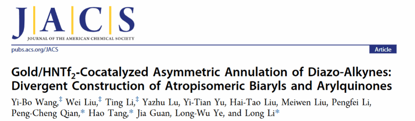 此项工作以Gold/HNTf2-Cocatalyzed Asymmetric Annulation of Diazo-Alkynes: Di-vergent Construction of Atropisomeric Biaryls and Arylquinones为题发表在国际顶级期刊JACS上,云顶7610线路检测作为第一单位,钱鹏程教授,汤浩教授,李龙教授为通讯作者。该研究工作主要由钱鹏程-李龙团队2022级研究生王一波、博士后刘玮、李亭共同完成,并得到课题组其他研究生和本科生协助。理论计算部分由云顶7610线路检测汤浩教授完成。同时南方科技大学李鹏飞教授对我们的工作中绝对构型的测定做出突出贡献。研究工作得到国家自然科学基金(21828102, 22303062, 22401218)、浙江省自然科学基金(LQ23B020002, LY22B030002, LQ22B030004)温州市科技局项目(G20220023),温州市化学会服务站等资助。