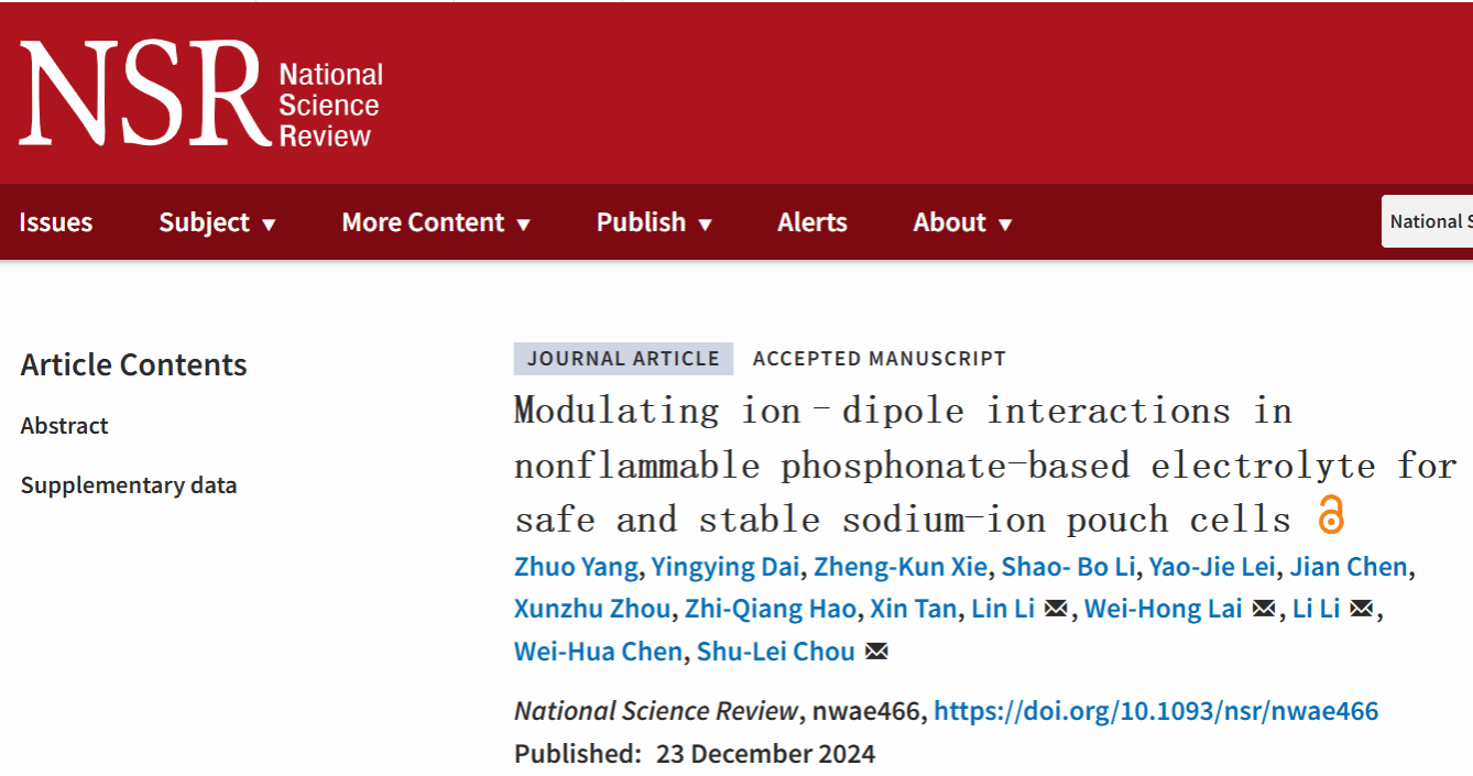 近日公司云顶7610线路检测李林特聘教授团队联合复旦大学赖伟鸿研究员及上海大学李丽教授在国际权威期刊National Science Review上发表题为《Modulating Ion-Dipole Interactions in Nonflammable Phosphonate-Based Electrolyte for Safe and Stable Sodium-Ion Pouch Cells》的学术论文,这也是公司首次在该期刊上发表论文。在本研究中通过阳离子-阴离子间相互作用的调节以及分子空间位阻的差异,选择性增强低溶剂化能配体分子在Na+溶剂化壳层中的配位数,从而实现有利且可调的界面化学。基于此,作者将一系列低溶剂化能的碳酸酯分子(EC、PC、VC、DEC、EMC)分别引入到高溶剂化能的磷酸酯(TEP)溶剂中,通过增强Na+阳离子与ClO4-阴离子之间的相互作用,选择性的提高了低溶剂化能的碳酸酯分子的竞争配位能力,促使形成富含碳酸酯分子的溶剂化结构,最终构筑了以碳酸酯分子分解为主的稳定界面化学。得益于此,该电解液设计解锁了低溶剂化能分子在溶剂化壳层中较弱竞争配位能力的限制,构建了一种低成本、完全无氟且阻燃的电解液,使得普鲁士蓝||硬碳软包电池在高负载量条件下(正极:20 mg/cm-2;负极:12 mg/cm-2)循环50圈后,仍有高达96%的容量保持率,展示了巨大的实际应用潜力。相关文章发表在National Science Review上,云顶7610线路检测为第一通讯单位,第一作者曾是公司联培生杨卓,目前在复旦大学攻读博士学位,公司侴术雷教授,李林特聘教授以及复旦大学赖伟鸿研究员、上海大学李丽教授为共同通讯作者,相关工作受到国家自然科学基金,浙江省自然科学基金,国家电网科技项目以及温州自然科学基金的资助。