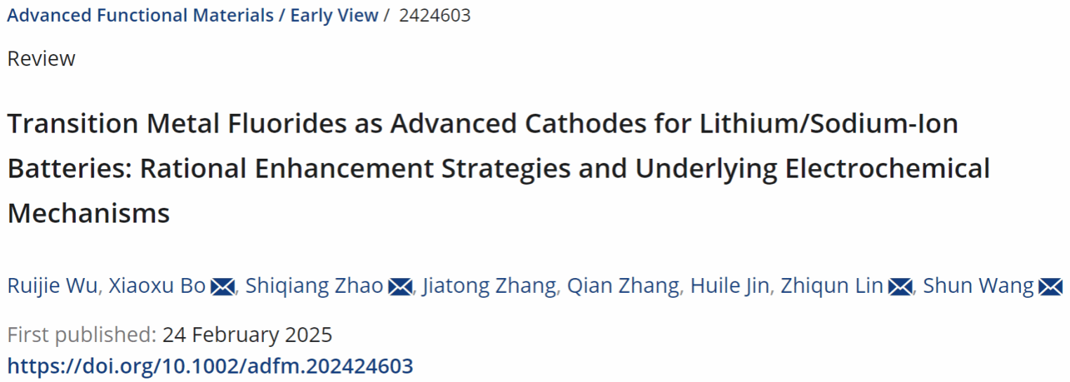 该成果以“Transition Metal Fluorides as Advanced Cathodes for Lithium/Sodium-Ion Batteries: Rational Enhancement Strategies and Underlying Electrochemical Mechanisms”为题发表在国际材料类顶级期刊⟪ Advanced Functional Materials ⟫上。云顶7610线路检测为第一通讯单位,公司2022级硕士生吴瑞洁为第一作者,公司赵世强副教授、王舜教授、温州科技职业公司薄晓旭博士、新加坡国立大学林志群教授为共同通讯作者。相关研究工作受到国家自然科学基金项目(21905208、52331009)、浙江省自然科学基金(LY23B030001)和温州市基础科研项目(G20240025)的资助。