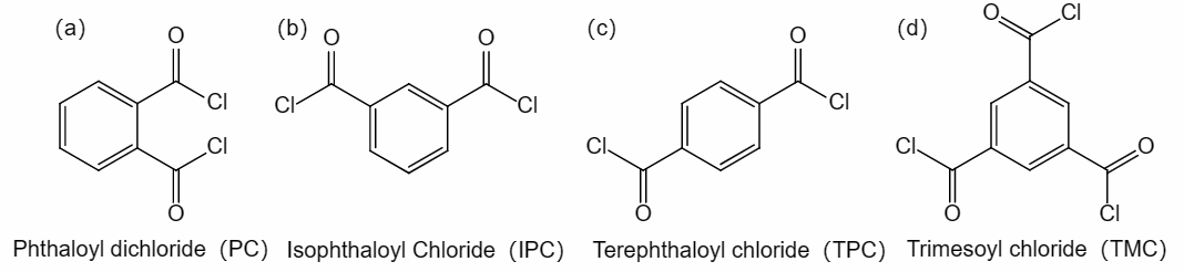 图1. 有机相单体的化学结构:(a)PC;(b)IPC; (c)TPC; (d)TMC