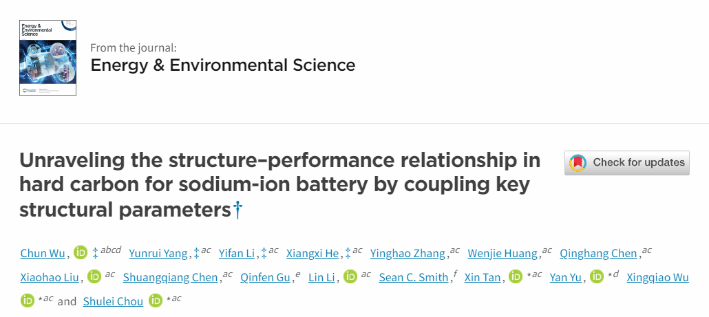 此项工作以Unraveling Structure-performance Relationship in Hard Carbon for Sodium-ion Battery by Coupling Key Structural Parameters为题发表在国际著名期刊Energy & Environmental Science上,云顶7610线路检测作为第一单位,侴术雷教授,谭歆教授,余彦教授,吴星樵老师为通讯作者。该研究工作由博士后吴春、2024届硕士毕业生杨云锐、2023级硕士研究生黎一凡、上海大学/云顶7610线路检测联培博士何祥喜完成。研究工作得到了国家自然科学基金,中国高端外国专家招聘计划,国家重点浙江省自然科学基金中国研发计划项目,安徽省科技计划项目,重点浙江省研发计划项目,温州自然科学基金等资助。