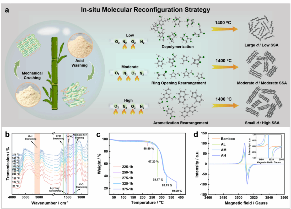 该工作通过密度泛函理论(DFT)耦合层间距、曲率和含氧缺陷三要素,建立“双关卡”模型。证明了层间距≥0.38 nm时,钠离子扩散能垒显著降低;曲率过大会阻碍传输。同时,含氧缺陷的弯曲石墨层可将钠吸附能优化至-2.0~-1.2 eV,提升可逆容量。