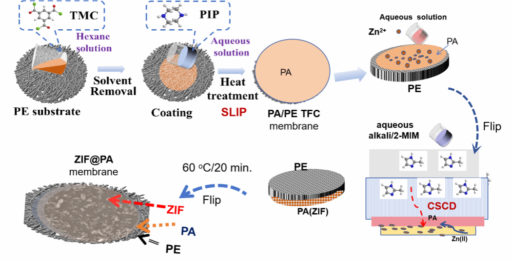 鉴于此,公司薛立新研究员,在国际知名的期刊 Materials Science for Energy Technologies上发表题为“Superior polyethylene based total heat exchange membranes made from sealing polyamide separating layers with in situ grown ZIF-8 particles”的研究论文。该研究为了提高聚酰胺(PA)/聚乙烯(PE)基薄膜复合材料(TFC)全热交换膜(THEMS)的性能,开发了Zn(II)溶液和2-甲基咪唑(2-MIM)-氨溶液(pH=10)之间的跨基底反向扩散(CSCD)过程,原位生长ZIF-8颗粒。来自CSCD工艺的原位生长的ZIF颗粒通过密封缺陷点有效地阻止了穿过PA分离层的CO2泄漏,并提供了选择性的水蒸气渗透通道和表面积以提高能量回收效率。系统研究了Zn(II)负载量、CSCD反应时间和配体种类对材料结构、CO2阻隔性能和热交换效率的影响。在优化条件下,ZIF-8颗粒封孔可使CO2渗透率从7.5GPU降低到1.15GPU,显热、潜热和热交换效率分别从80%、53%、68%提高到96%、73%和82%。