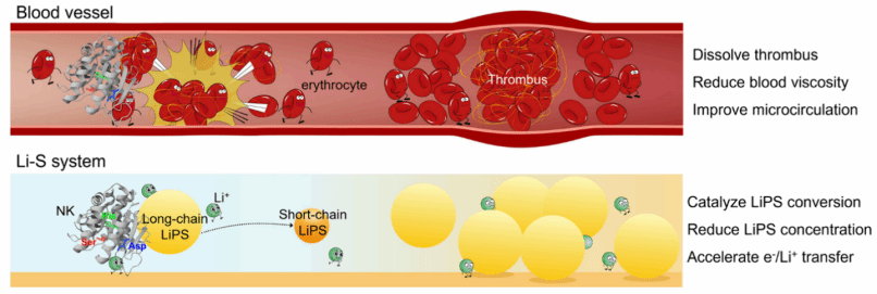 近日,受纳豆激酶(NK)溶解血栓和改善血液微循环功能的启发,公司杨植教授、杨硕副教授团队与中国科学技术大学江俊教授团队联合开发了一种高效的多硫离子转化仿生酶用于碳纳米管负载硫正极——NK及其肽基模拟酶(丝氨酸-组氨酸-天冬氨酸三联体活性中心,Ser-His-Asp)。密度泛函理论计算、原位光谱和电化学分析,揭示了其独特的催化机制:天冬氨酸(Asp)强电负吸附固定LiPSs,丝氨酸(Ser)电子轴拉伸催化S-S键断裂,组氨酸(His)亲锂位点促进电荷/Li⁺传输。通过机器学习优化配方,该催化剂显著提升了贫电解液条件下的SRR动力学,实现高倍率容量(744 mAh g⁻¹,5 C)、长循环寿命(250圈容量衰减率0.096 %)和高面积容量(8.87 mAh cm⁻²,E/S=4 μL mg⁻¹)。这一研究结果从生物酶到电化学,跨界创新,重新定义了锂硫电池催化的未来。