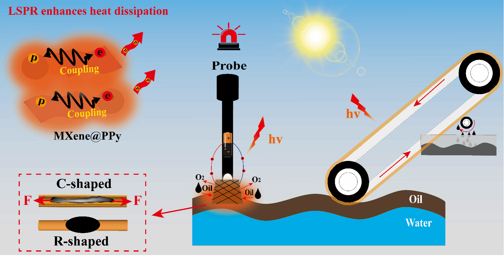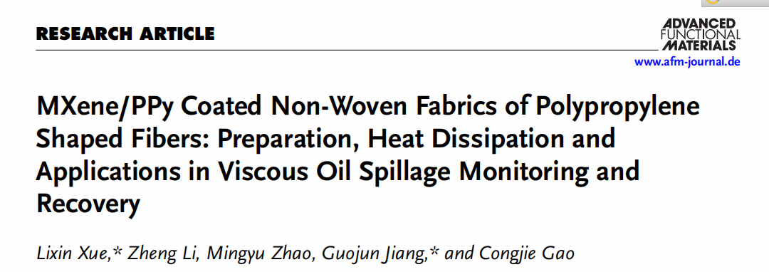 该研究成果以“MXene/PPy coated non-woven fabrics of polypropylene shaped fibers: preparation, heat dissipation and applications in viscous oil spillage monitoring and recovery”为题,发表在国际期刊《Advanced Functional Materials》上。该工作的指导老师包括云顶7610线路检测薛立新研究员、浙江工业大学之江公司蒋国军副教授和膜分离与水科学技术中心高从堦院士,参与的研究生包括浙江工业大学李正博士和赵明宇硕士。