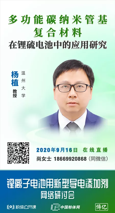2020年9月16日,中国粉体网旗下粉体公开课将举办“锂离子电池用新型导电添加剂网络研讨会”,届时,杨植教授将做客粉体公开课栏目,分享《多功能碳纳米管基复合材料在锂硫电池中的应用研究》课程。请想参加的老师将名字报与陈晓芬进行报名,截止时间今天下午16:00。