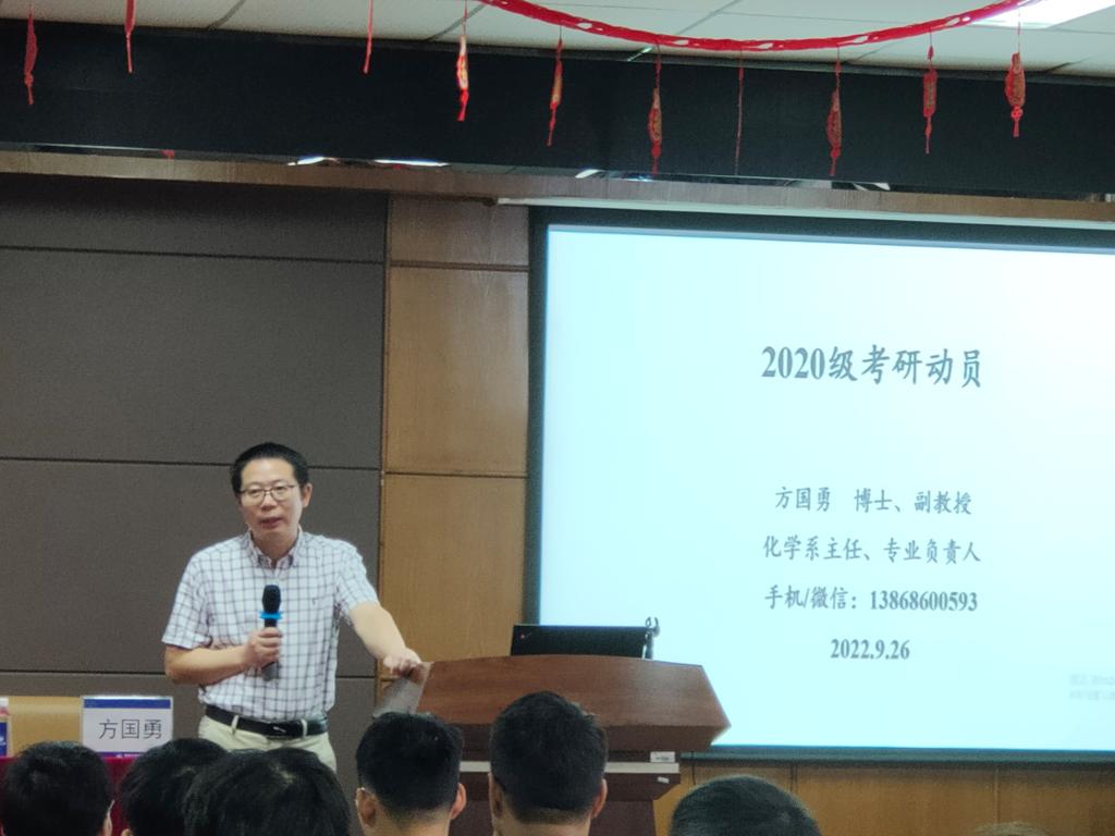 为使同学们对考研院校、专业的选择有更深入的了解,公司于9月26日在208会议室举办了2020级员工考研动员大会。特邀请化学系主任方国勇老师为员工讲解。