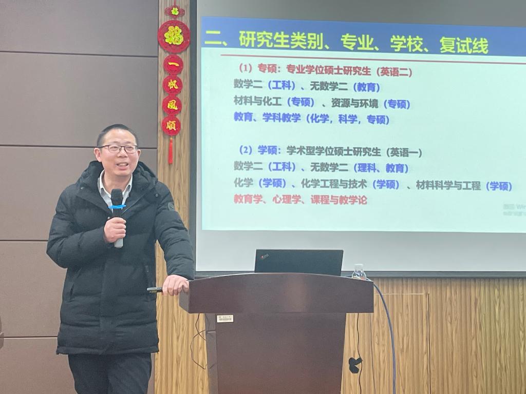 最后,化学系主任方国勇老师进行总结,方老师分析了2024年考研形势,介绍了研究生的类别、专业、公司、复试线和考研的注意事项,强调了选择大于努力,并预祝各位同学好运,考研顺利。