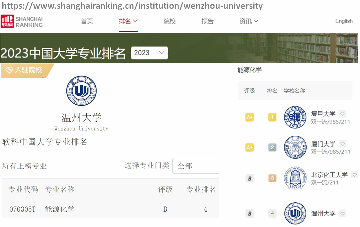 能源化学专业面向国家新能源产业重大战略发展需求,于2020年获教育部批准建立的新兴热门专业,依托化学一级学科博士学位授权点、化学和材料科学与工程两个国家一流本科专业建设点及一级学科硕士学位授权点,拥有能源化学领域雄厚团队和完备科研创新训练平台,是国内创办该专业的第五所本科高校、浙江省本科高校首设专业,在2023年软科中国大学专业排名中位列第四名。