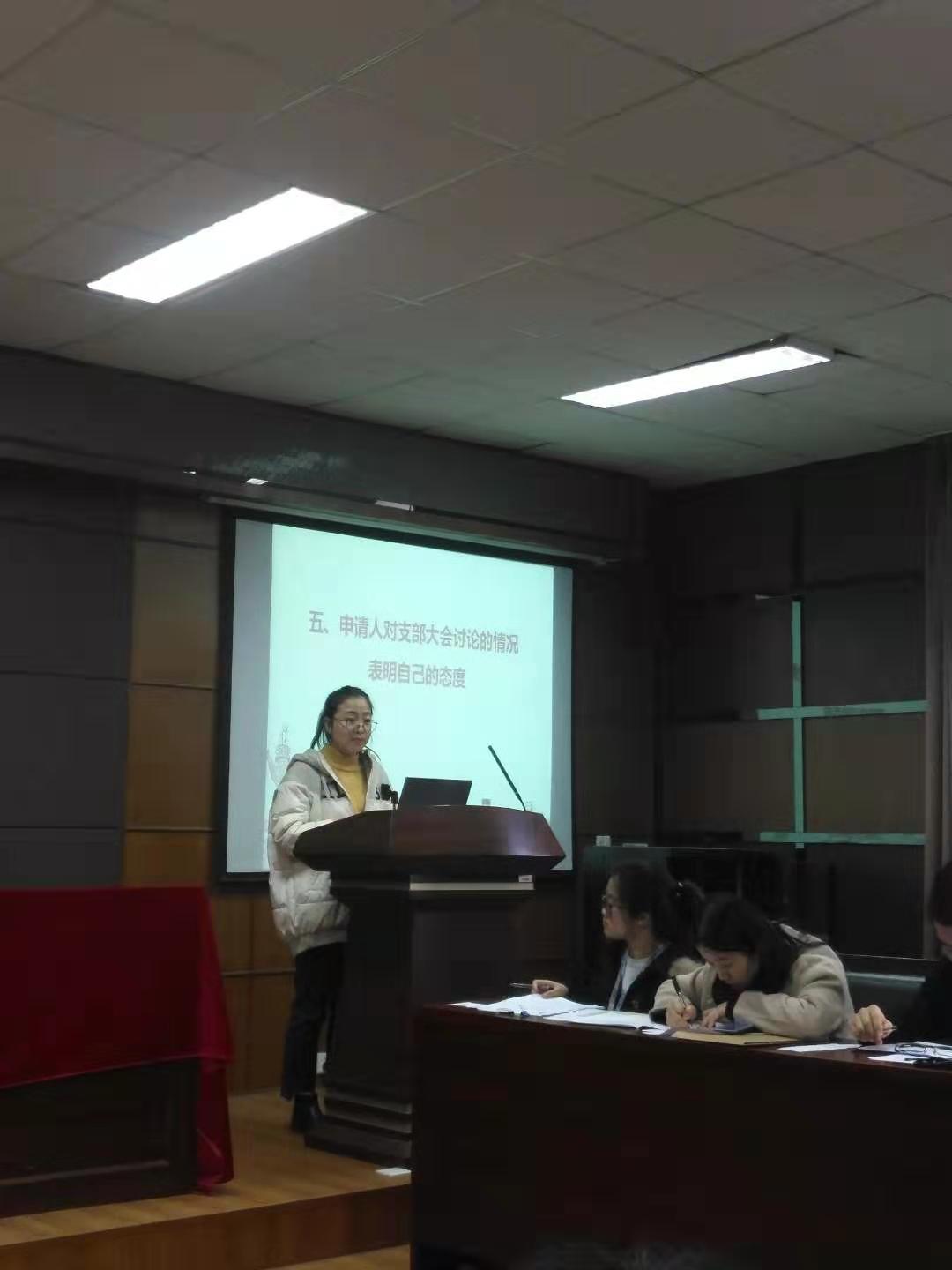 会议严格按照党组织接收预备党员程序进行。首先由崔翠霞和丁玲两位申请人宣读《入党志愿书》,汇报有关情况以及需要向党组织说明的问题。入党介绍人介绍申请人的主要情况并对其能否入党表明自己的意见。接下来支部报告对申请人的审查情况,与会党员发表意见,对申请人能否入党进行讨论。申请人对支部大会讨论的情况表明自己的态度。最后,拥有表决权的正式党员进行无记名投票方式表决。大会认为崔翠霞和丁玲同志已经符合成为一名中共预备党员的要求,同意接收,并鼓掌表示祝贺。