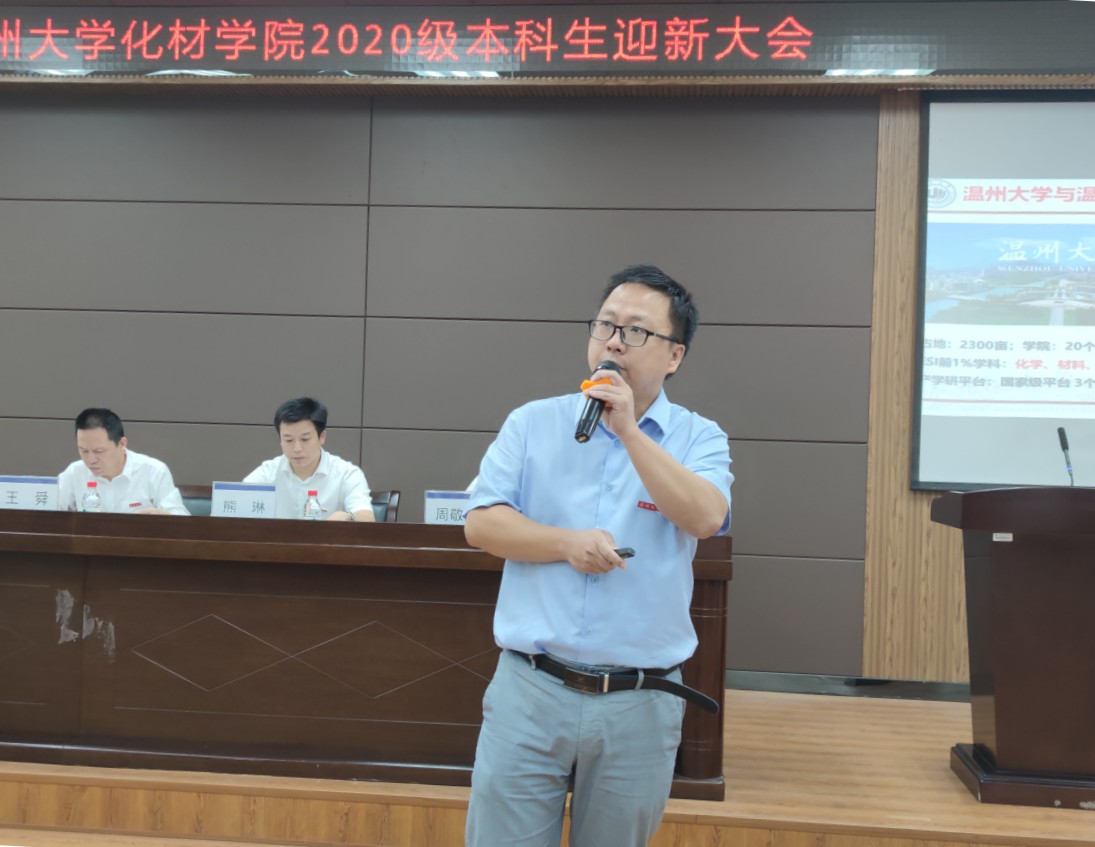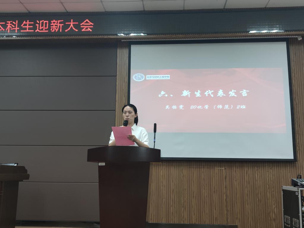之后,由18化学创新班徐北航作为老生代表讲话,他对新生提出几点建议:明确目标;做出正确选择;与人为善,真诚待人。由20化学师范2班吴怡雯同学作为新生代表讲话,她对未来四年的老员工活表示美好的期待。