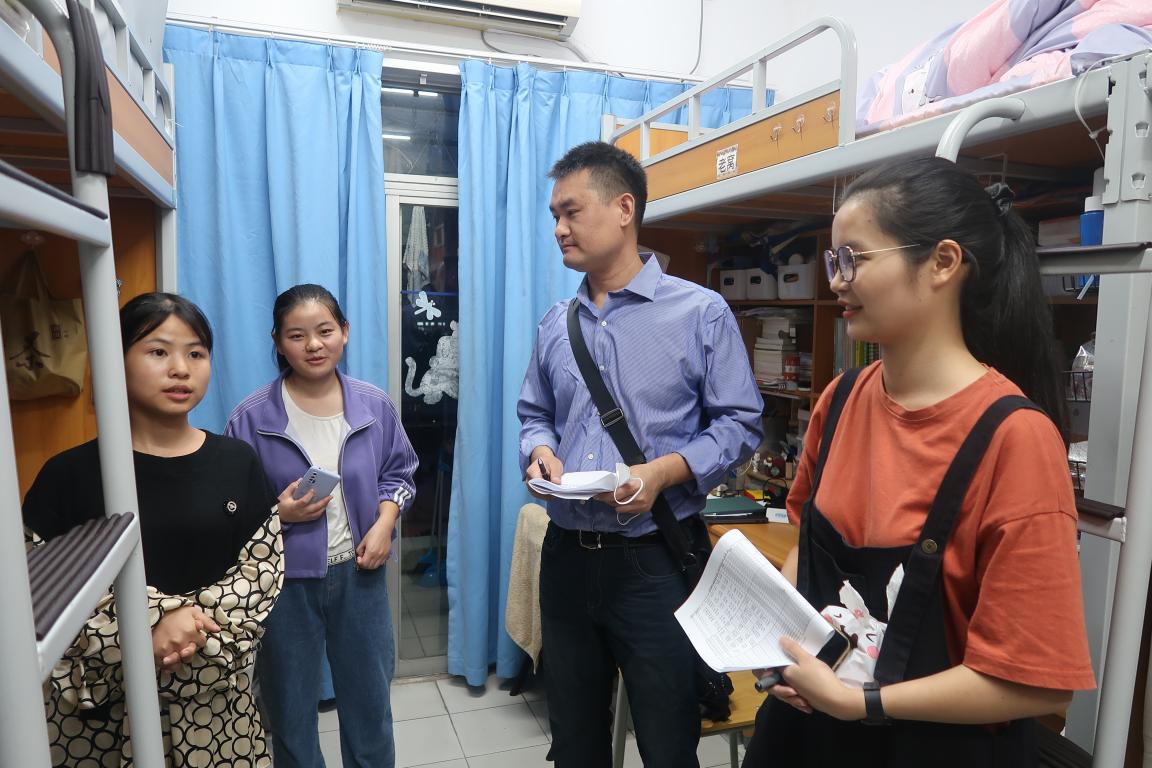 在走访各新生寝室的过程中,老师们对新生的寝室环境、校园适应等方面进行了亲切的询问,表示了充分的关心。老师们耐心解答新生提出的各方面问题,主动了解新生的家乡,鼓励新生珍惜大学时光,做好大学规划,重视专业知识的学习和技能的掌握。同时,老师们和班助们多次提醒新生谨防诈骗,注意保护财产,树立防骗意识和安全意识。员工会成员分享了在班委竞选等方面的经验,鼓励新生大胆锻炼自身,多多发掘自身的才能。