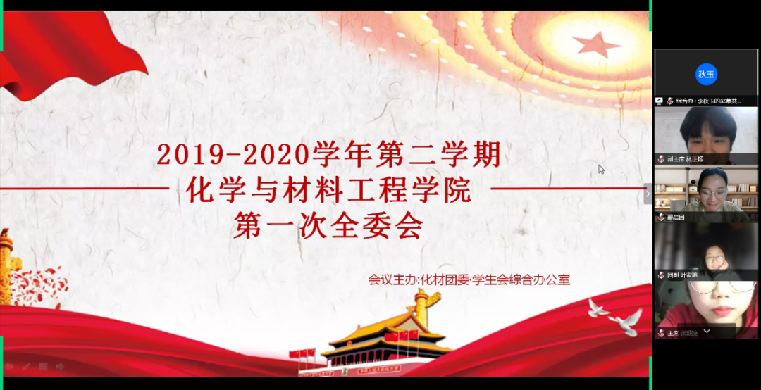 受此次疫情影响,我们化材团委·员工会于4月3日晚19:00召开线上会议。出席此次会议的有化材党委副书记周敬业老师、团委书记孙玮玮老师、公司辅导员邹涌彬和薛涛老师。另有团委员工会主席团成员、各中心主任及干事参与。