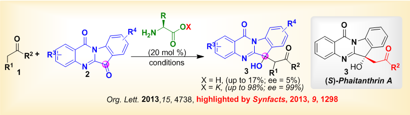 9.Amino Acid Salts Catalyzed Asymmetric Aldol Reaction of Tryptanthrin: A Straightforward Synthesis of Phaitanthrin A and Its Derivatives. Guowei Kang, Zhenli Luo, Chongxing Liu, Hang Gao, Quanquan Wu, Huayue Wu,* Jun Jiang*,Org. Lett. 2013,15(18),4738–4741