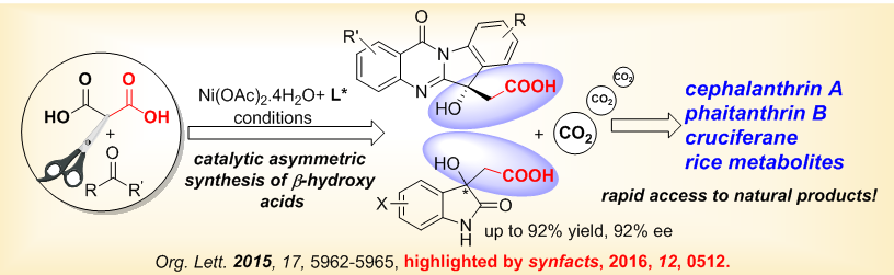 7.Direct Catalytic Asymmetric Synthesis of β?Hydroxy Acids from Malonic Acid Hang Gao, Zhenli Luo, Pingjin Ge, Junqian He, Feng Zhou, Peipei Zheng, and Jun Jiang*Org. Lett. 2015, 17, 5962-5965